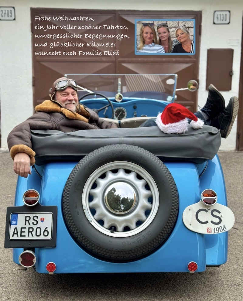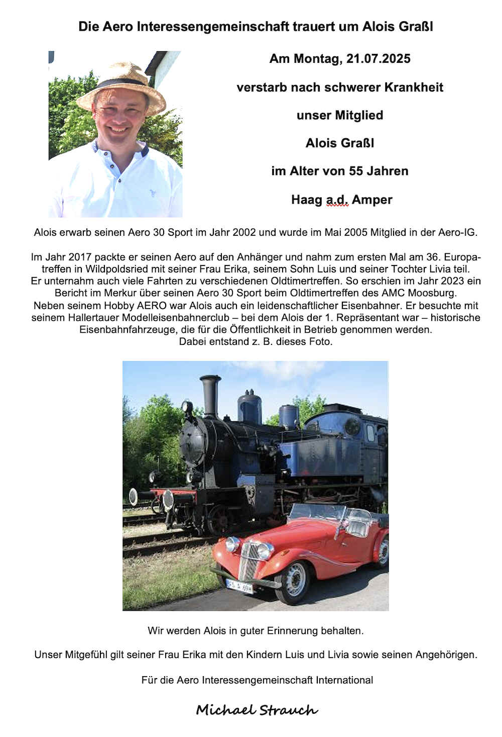 Aero 30 Kabriolett am Grab von Josef Sodomka im Juji 2025 Im Zusammenhang mit 130 Jahre Firmengeschichte Sodomka und dem 30. Treffen der Sodomka-Freunde wurde Michael Strauch die Ehre zuteil, mit seinem Aero 30 Kabriolett von 1937 das Familiengrab im Friedhof von Vysoke Myto zu besuchen.