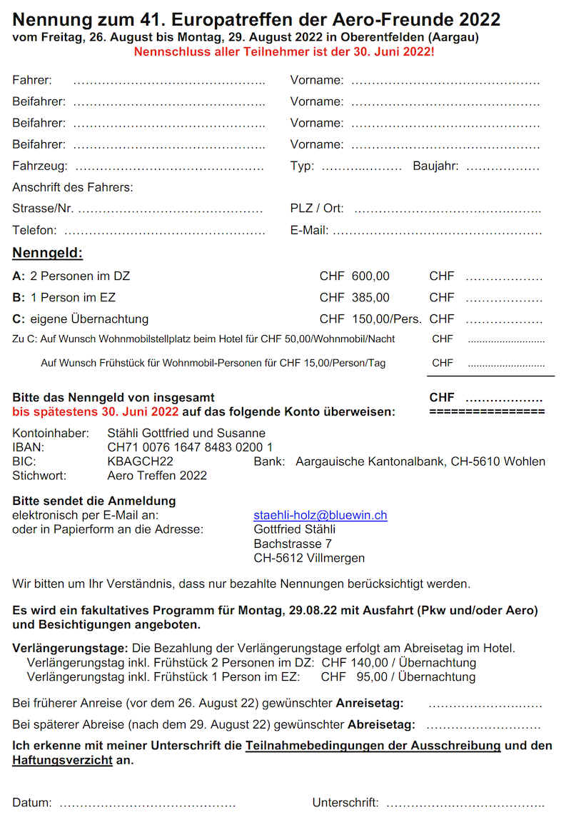 41. Europatreffen 2022 - Anmeldung und Nennung